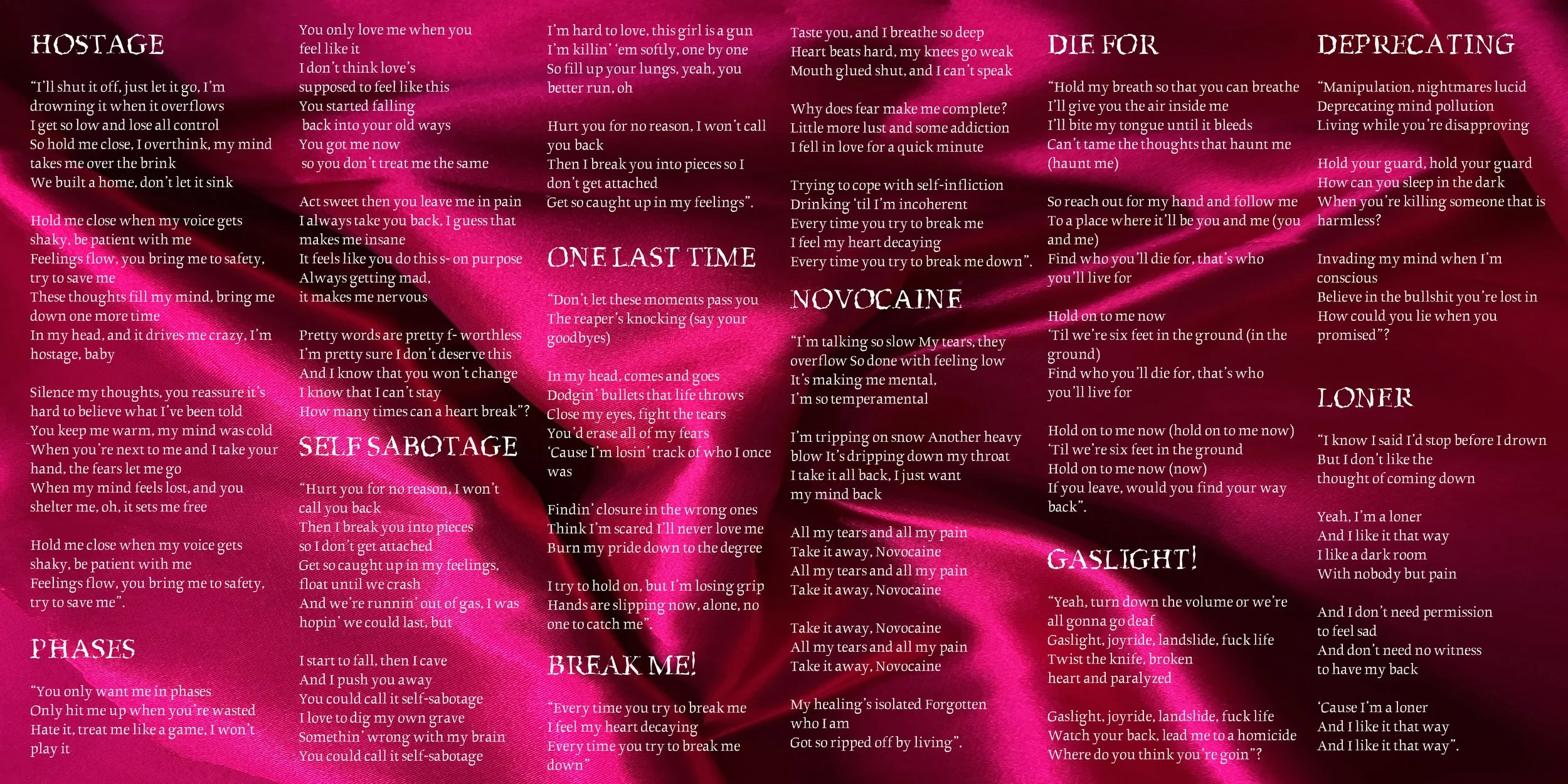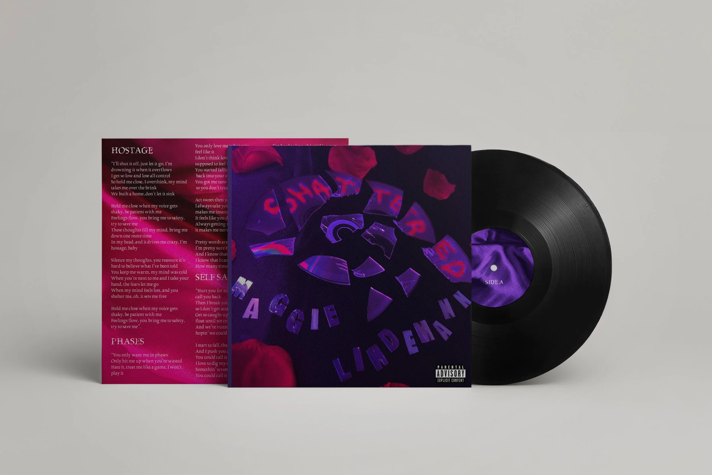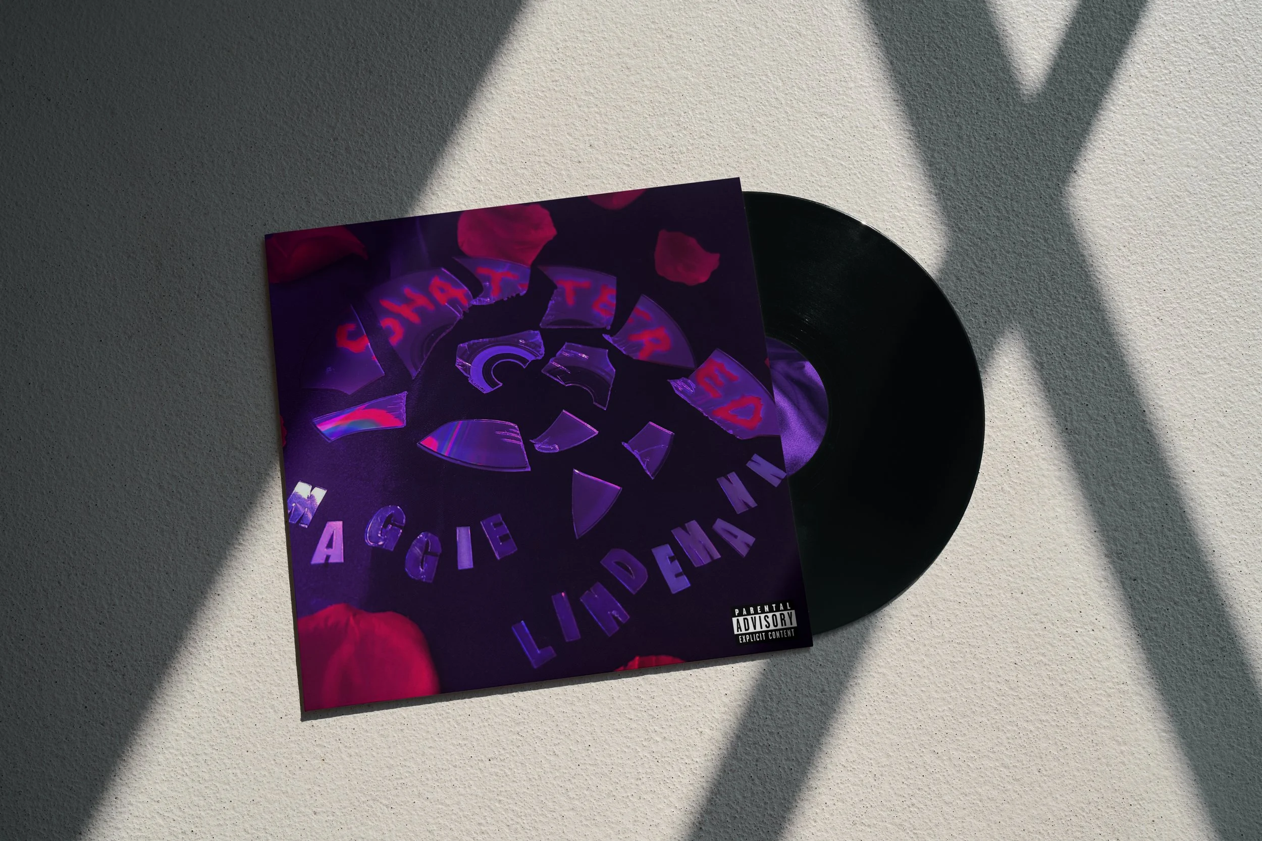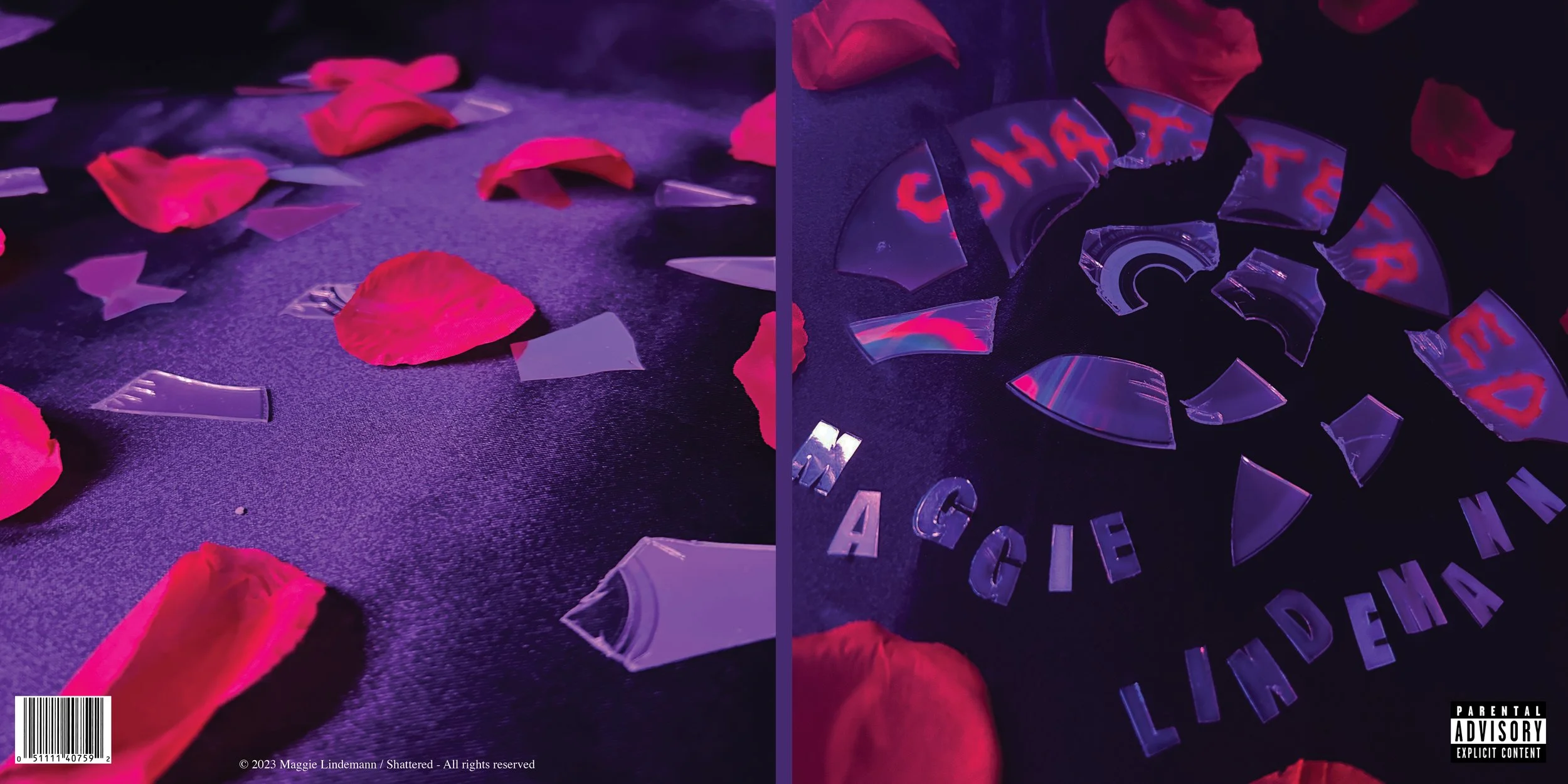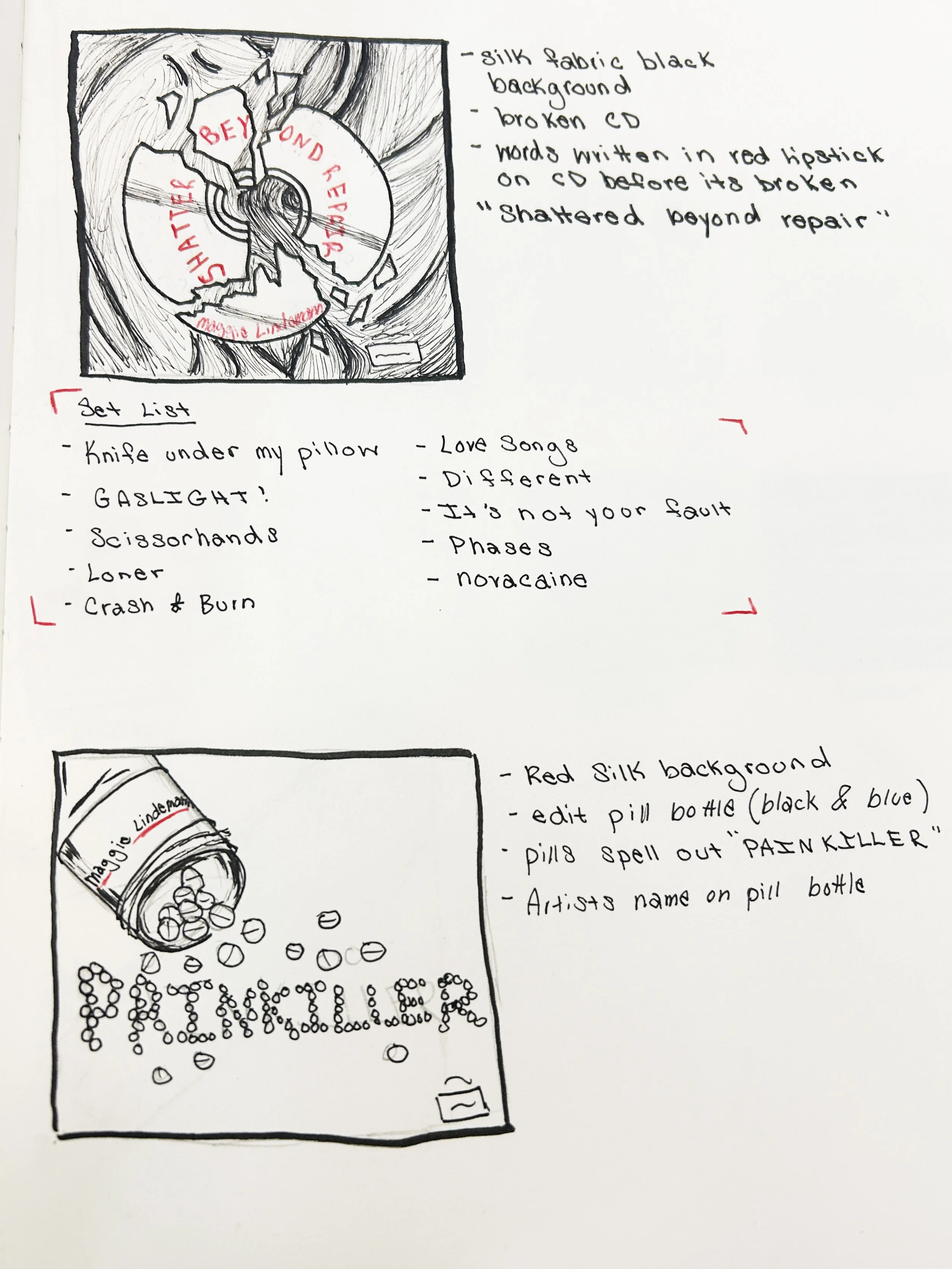 I began by sketching out different design concepts to explore how I could visually represent the mood and themes present in Maggie’s music. My goal was to capture both the emotional intensity and the darker, more vulnerable undertones of her sound. From there, I experimented with a variety of materials and techniques to develop a distinctive “shattered” effect for the album cover.