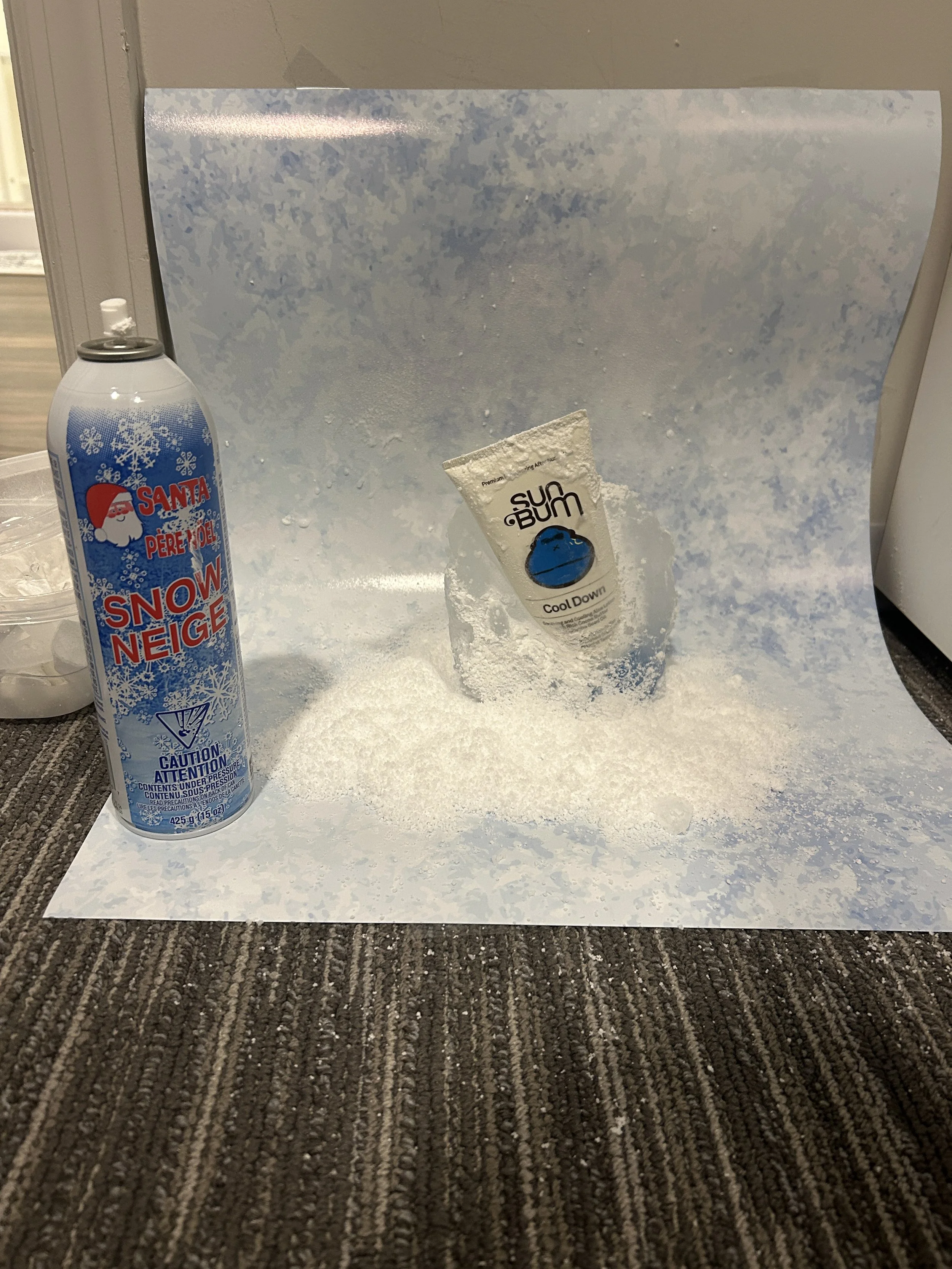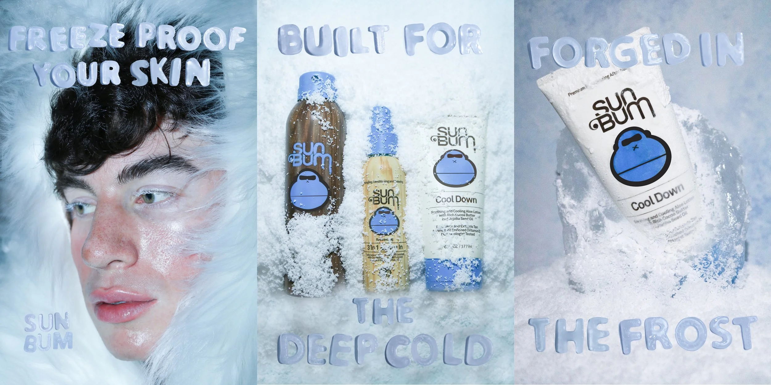 The campaign began with mood boarding to explore how Sun Bum’s playful, warm identity could translate to a winter setting. I experimented with tactile techniques custom ice lettering, frozen and painted products to bring the concept to life, using lighting and styling to unify the icy visuals while keeping the brand’s personality intact. The process was rooted in hands on experimentation, reimagining the brand in a fresh, seasonal way.